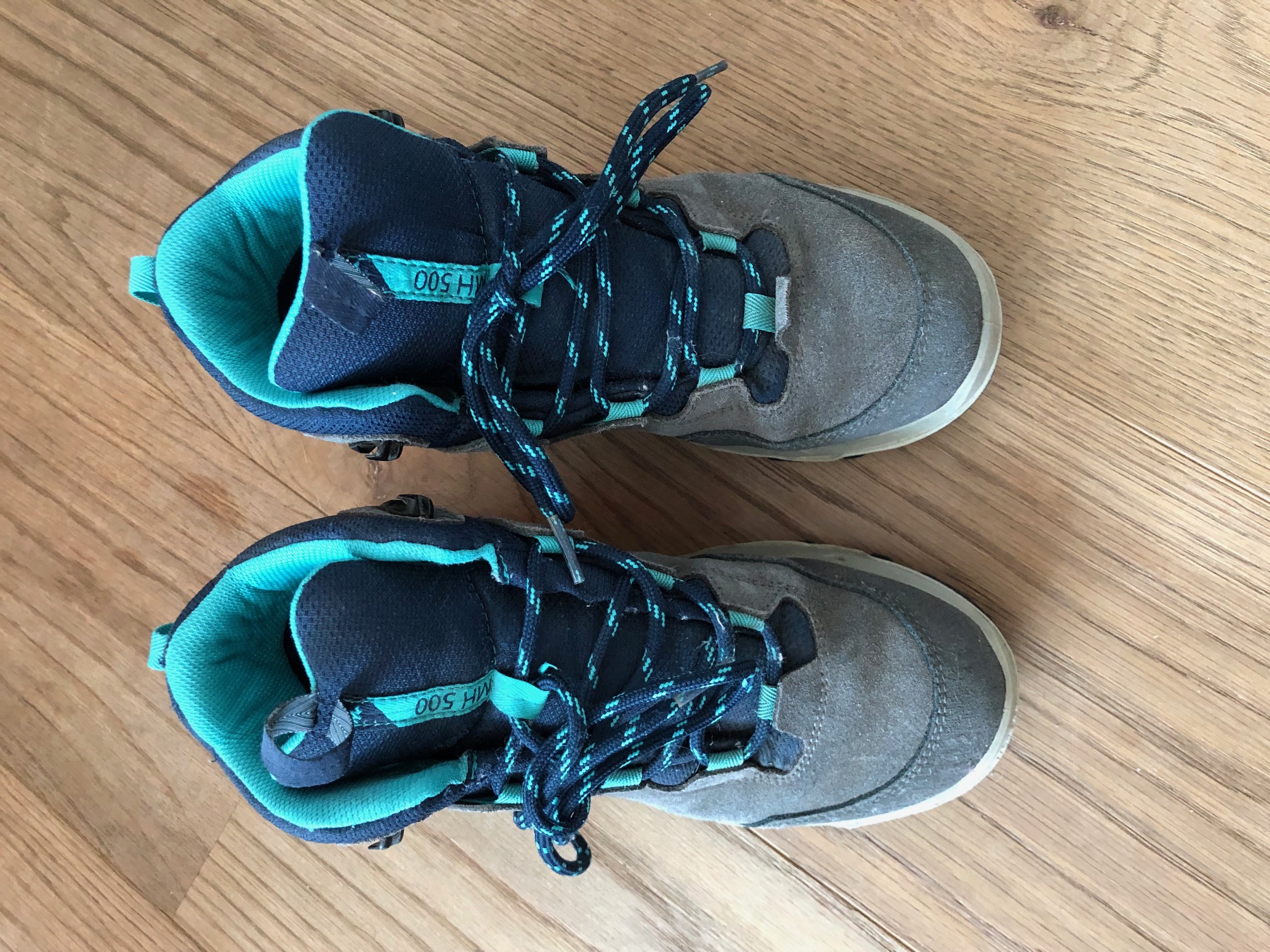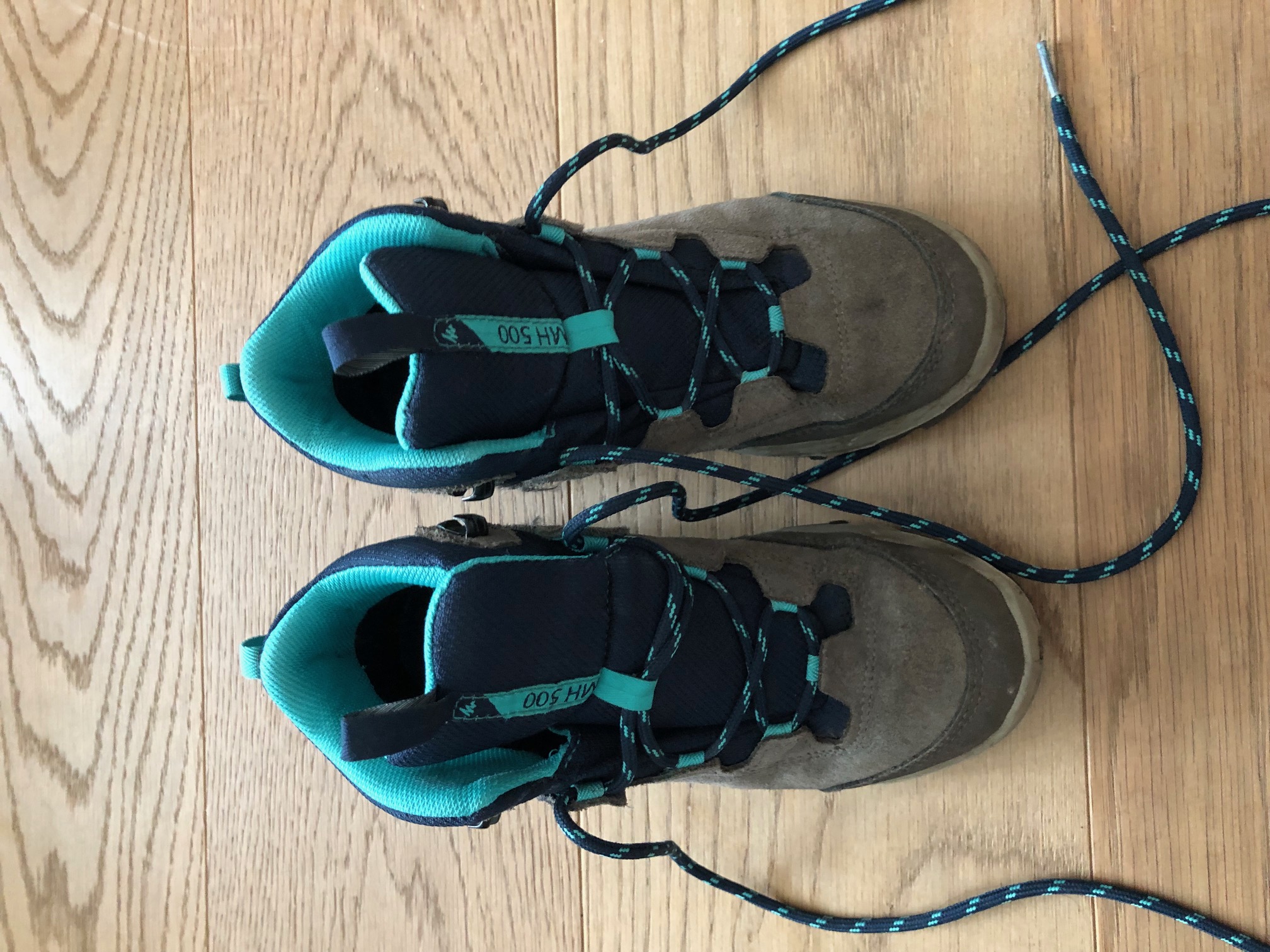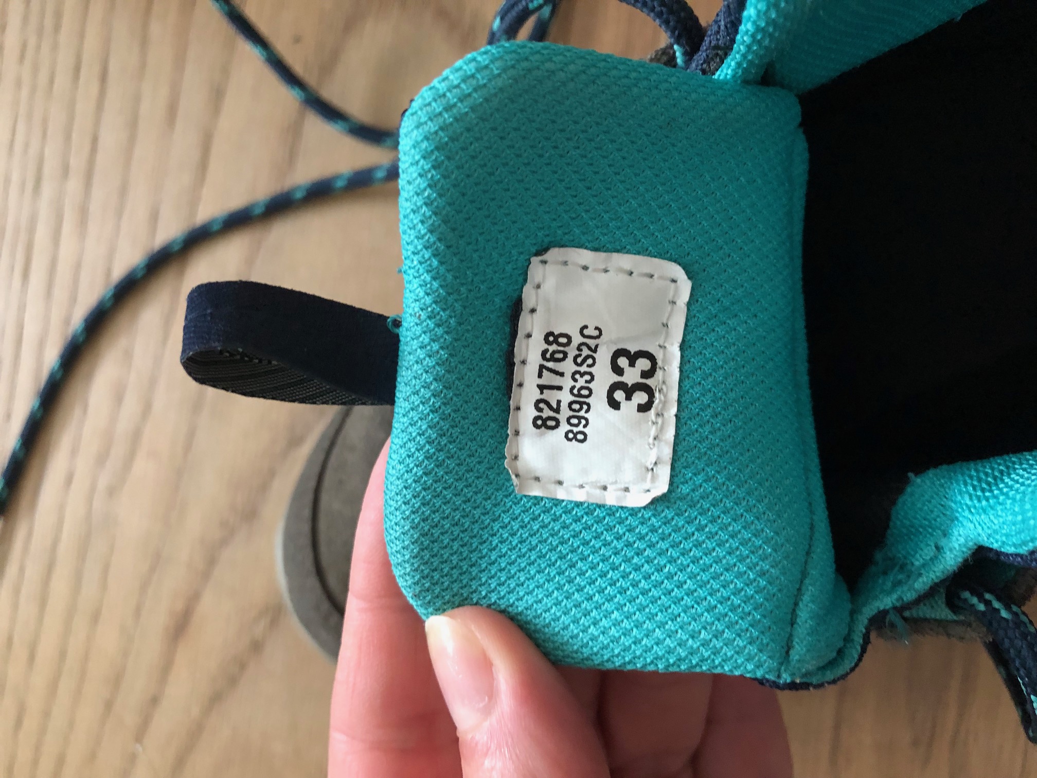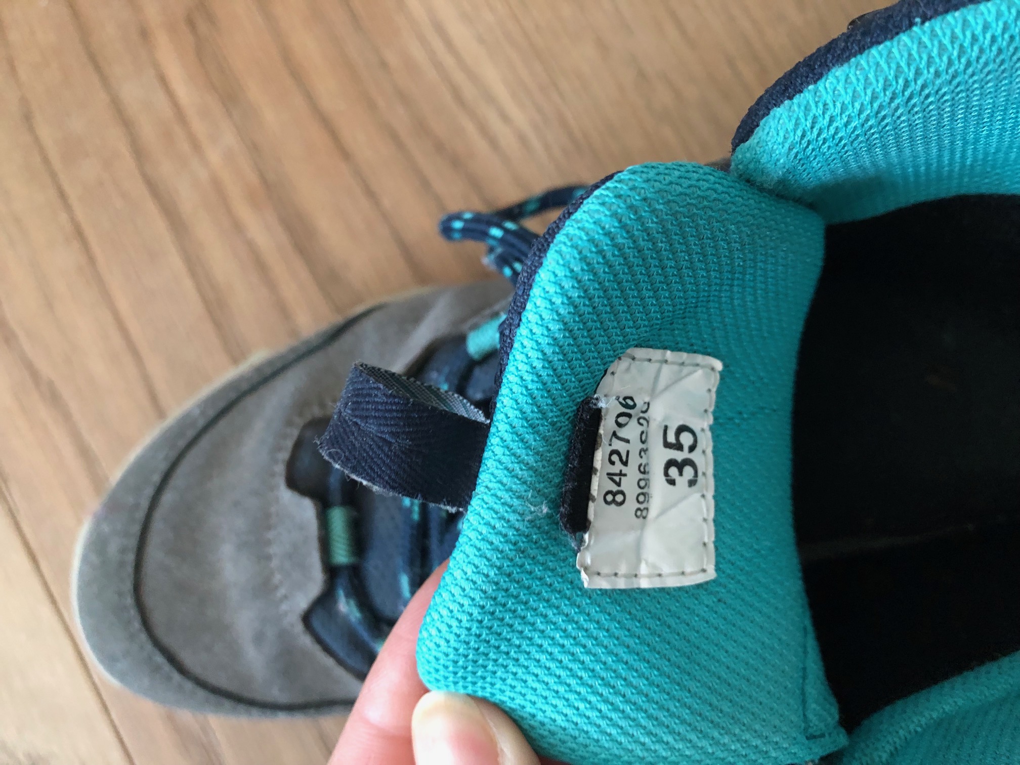 Délka 22,5 cm. Nošené 2 sezóny pouze na výpravy a na táboře, trochu nižší model s gumovou vložkou pro lepší ohebnost boty ve špičce (už není na trhu).